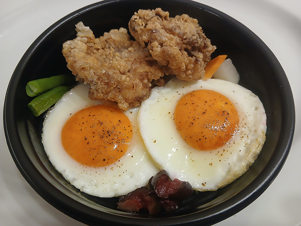 唐揚げ2個と野菜コロッケ1個の入った腹持ちの良い丼物です。