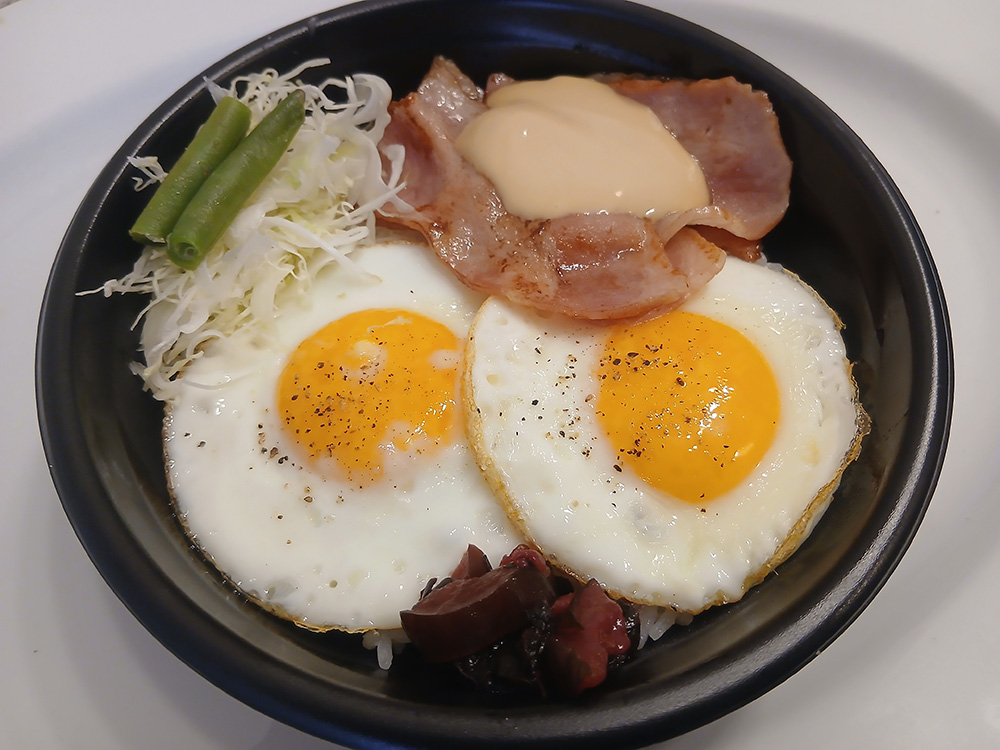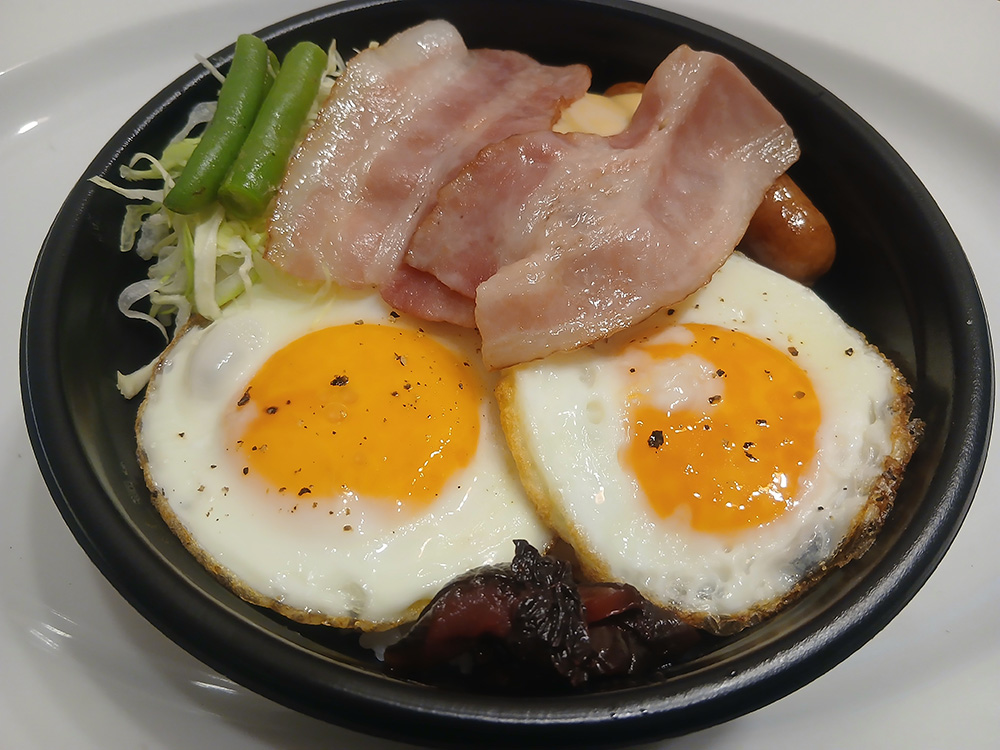 ベーコン4枚、目玉焼き2枚、特製ソース