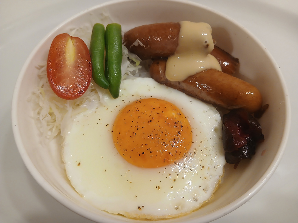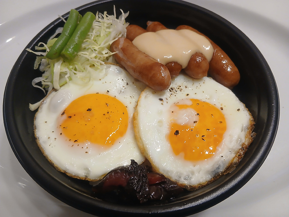 ソーセージ3本、目玉焼き1枚、特製ソース